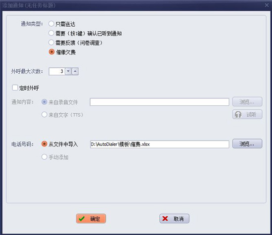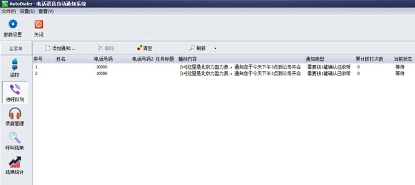• 在待呼隊列中,外呼模式選擇催費;呼叫次數(shù)為3(允許失敗重呼);呼叫號碼,選擇之前編輯的excel,這樣就能導(dǎo)入一批外呼通知任務(wù),到待呼隊列中。