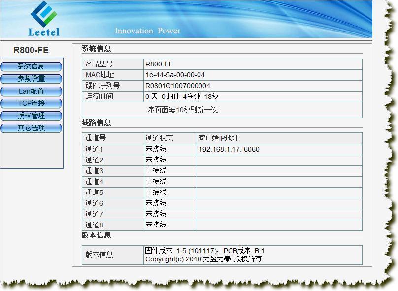 ????? Rx00-FE設(shè)備內(nèi)置了一個WEB服務(wù),用戶可以通過瀏覽器訪問,設(shè)置參數(shù)。在瀏覽器的地址欄中輸入設(shè)備的IP地址,回車后,出現(xiàn)設(shè)備的WEB頁面。在左邊選中參數(shù)設(shè)置,右邊將出現(xiàn)參數(shù)設(shè)置頁面。先選擇通道,然后在底下輸入對應(yīng)的客戶端IP地址和端口,點擊右邊的“應(yīng)用”按鈕。