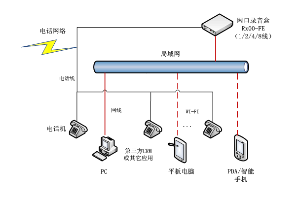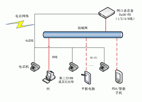 ????? 說明:1至8線的嵌入式網(wǎng)口電話錄音盒通過網(wǎng)線,接到局域網(wǎng)上。需要處理的固定電話,通過電話線分別接到錄音盒上。固定電話所對應(yīng)的PC、平板電腦、PDA或智能手機通過網(wǎng)線或者無線局域網(wǎng)(WI-FI)接到局域網(wǎng)上。