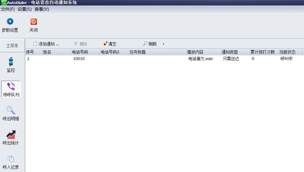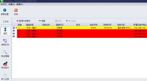 - 完備的監(jiān)控界面,可以查看各條線路的外呼催欠狀態(tài)。此外,設(shè)計(jì)了待呼隊(duì)列概念。只要待呼隊(duì)列有待呼叫的記錄,系統(tǒng)會自動獲取記錄,并啟動外呼。待呼隊(duì)列有可視界面,可以查看當(dāng)前等待外呼的任務(wù)信息,包括被叫號碼、播放內(nèi)容、呼叫模式和已呼次數(shù)等。
