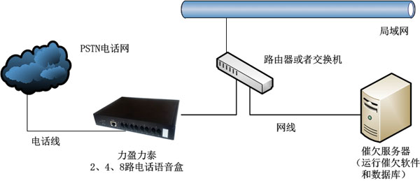說明:在分局或支局部署一臺力盈力泰8路電話語音盒(也可以2路或4路),接上8條模擬電話線,然后通過網(wǎng)線接到內(nèi)網(wǎng),并為該設(shè)備設(shè)置一個固定的內(nèi)網(wǎng)IP地址。在內(nèi)網(wǎng)找一臺電腦,作為催欠服務(wù)器,運(yùn)行催欠軟件。在催欠軟件設(shè)置里添加上該電話語音盒的IP地址,就能控制語音盒。