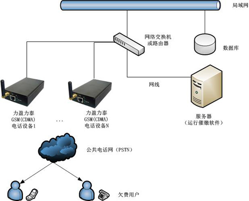 電話催繳系統(tǒng)采用了自主研發(fā)的的GSM/CDMA電話設(shè)備,通過(guò)電腦控制它依次撥打欠費(fèi)用戶的聯(lián)系電話,在對(duì)方接通后播放語(yǔ)音,提示對(duì)方及時(shí)繳納欠費(fèi)以及應(yīng)當(dāng)繳納的金額。