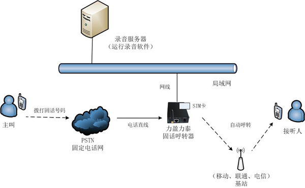 目前,有的企業(yè)或單位的人員在外出時(shí),需要將直線電話呼轉(zhuǎn)到某個(gè)手機(jī)號(hào)碼上進(jìn)行接聽(tīng),現(xiàn)成的方案是固話運(yùn)營(yíng)商提供的呼轉(zhuǎn)服務(wù)。這種方案雖然實(shí)現(xiàn)起來(lái)簡(jiǎn)單,但該企業(yè)無(wú)法對(duì)不經(jīng)過(guò)本線路的呼轉(zhuǎn)出去的通話進(jìn)行錄音,而且固話運(yùn)營(yíng)商也不提供通話錄音服務(wù),因此如果涉及到重要業(yè)務(wù)的直線電話,呼轉(zhuǎn)和錄音是個(gè)矛盾。