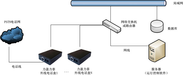在局域網(wǎng)里部署一個(gè)1至8路的力盈力泰RT系列網(wǎng)口電話盒,通過(guò)網(wǎng)線接到路由器或網(wǎng)絡(luò)交換機(jī)上。從需要處理的電話機(jī)(或者從集團(tuán)電話、電話交換機(jī))上引出電話線,分別接到電話盒的電話插口中。坐席所用的PC、平板電腦或智能手機(jī)通過(guò)網(wǎng)線或WIFI也接到局域網(wǎng)中。