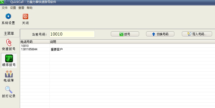 系統(tǒng)支持三種撥號(hào)方式:拷貝粘貼點(diǎn)擊撥號(hào)(隨需撥號(hào))、順序撥號(hào)(電話營(yíng)銷用,給一批陌生號(hào)碼依次撥號(hào))和電話本聯(lián)系人點(diǎn)擊撥號(hào)(固定聯(lián)系人撥號(hào))。這三種撥號(hào)方式,基本能夠滿足用戶的各種需求,可以廣泛用在電話調(diào)度、公司前臺(tái)、人工催費(fèi)、電話營(yíng)銷等。系統(tǒng)還支持鍵盤快捷鍵,一按回車鍵,就可撥出去。
