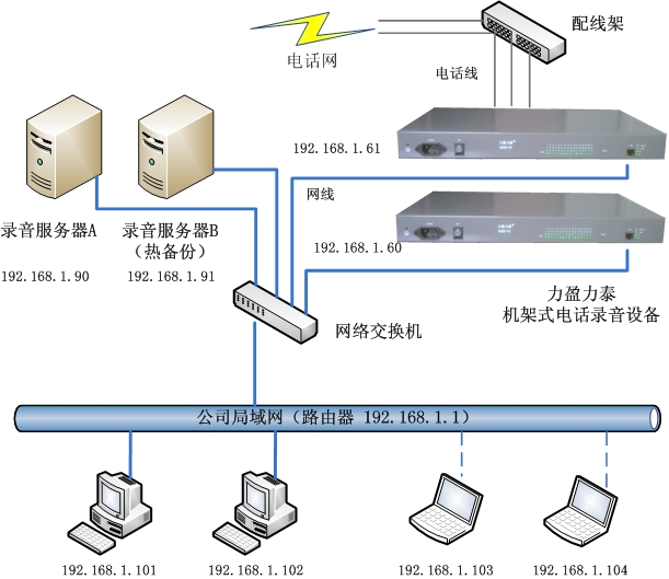 錄音設(shè)備通過網(wǎng)線接到網(wǎng)絡(luò)交換機上,錄音服務(wù)器的網(wǎng)卡也接到那臺網(wǎng)絡(luò)交換機上。此外,那臺網(wǎng)絡(luò)交換機本身通過網(wǎng)線接到公司的局域網(wǎng)(路由器)上。這種接法,錄音服務(wù)器除了能連接多臺錄音設(shè)備外,還能通過網(wǎng)絡(luò)交換機接到局域網(wǎng)里(上網(wǎng))。