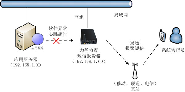 短信報(bào)警器通過路由器接到局域網(wǎng)內(nèi),設(shè)置成固定的IP地址。要監(jiān)控的服務(wù)器,可以運(yùn)行力盈力泰提供的心跳軟件,或者 按照協(xié)議開發(fā)心跳軟件,定時(shí)往報(bào)警器發(fā)送心跳包。如果報(bào)警器一段時(shí)間內(nèi)未收到心跳包,就認(rèn)為該服務(wù)器出現(xiàn)問題,它將自 動(dòng)往預(yù)設(shè)的電話號碼發(fā)送報(bào)警短信。
